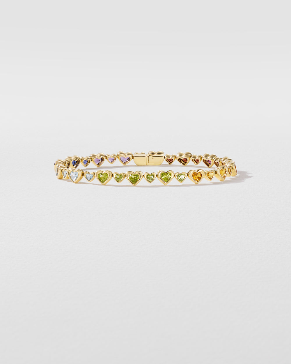 For those who wear their hearts on their sleeves; this scaled-down bracelet is decorated with semi-previous stones, in a full spectrum of colours. Set in 14k yellow gold.