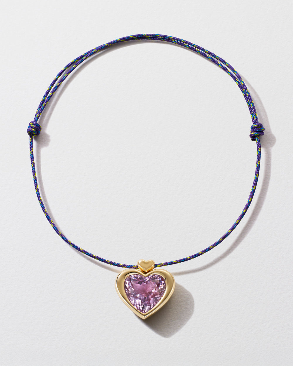 Beauty to behold; this eye-catching necklace features a vibrant 25ct kunzite, lovingly-set into a 14k yellow gold heart pendant, and hung on a torque choker.