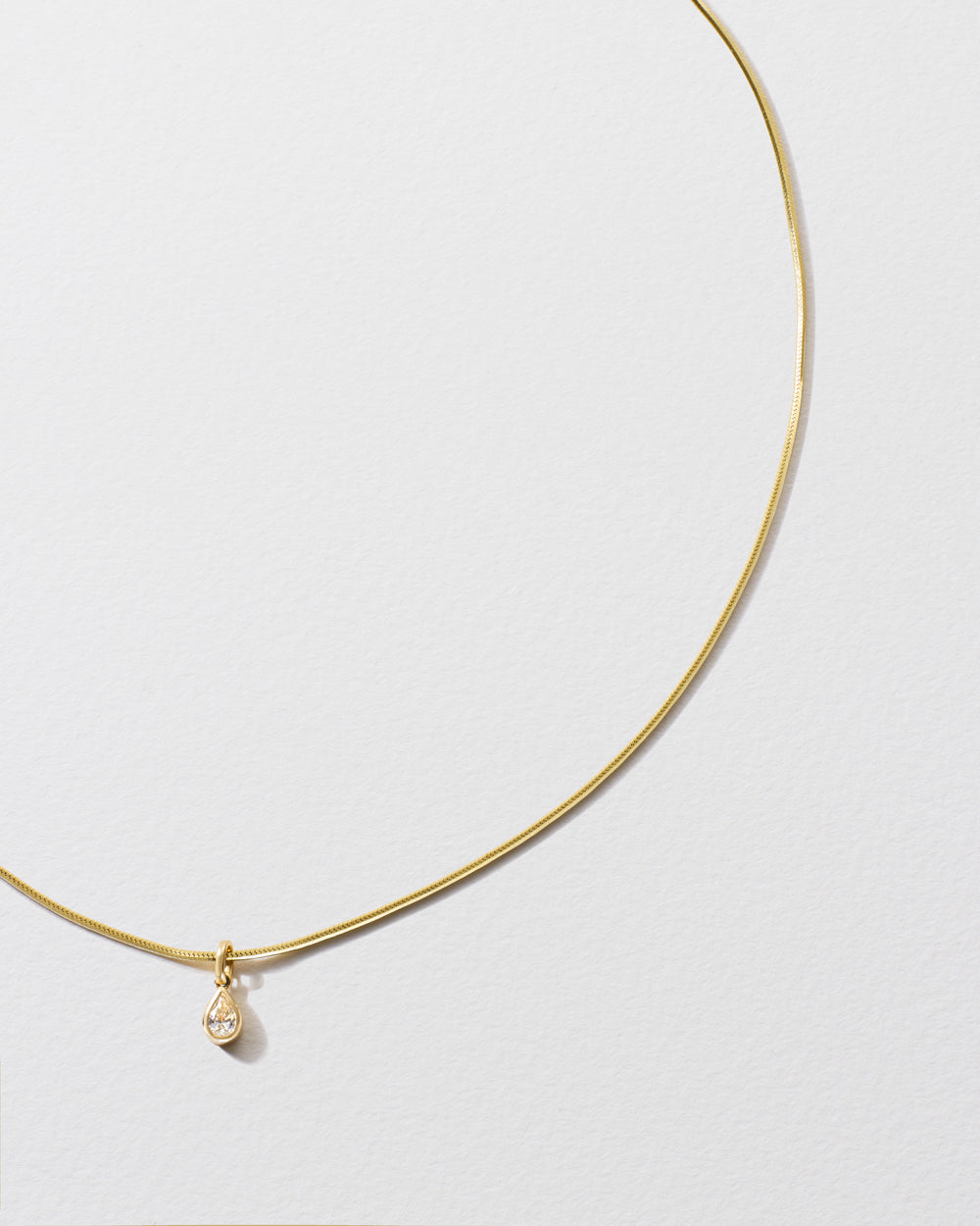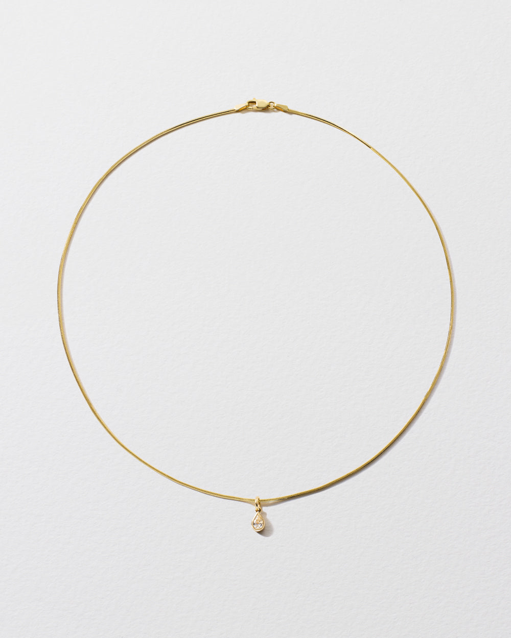 Curvy and swervy, this 14k yellow gold chain is adorned with a dangly drop pendant, punctuated with a precious pear-shaped diamond.